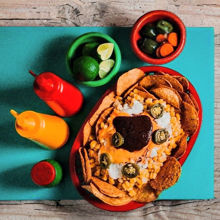 Charola con dos bolsas de frituras(Doritos rojos, Doritos negros, Doritos morados, Tostitos o Nachos), Maruchan y elote(Esquite) blanco o amarillo aderezado con mayonesa, mantequilla, limón, queso rayado, queso amarillo, cacahuates y chile al gusto(picoso o no picoso).