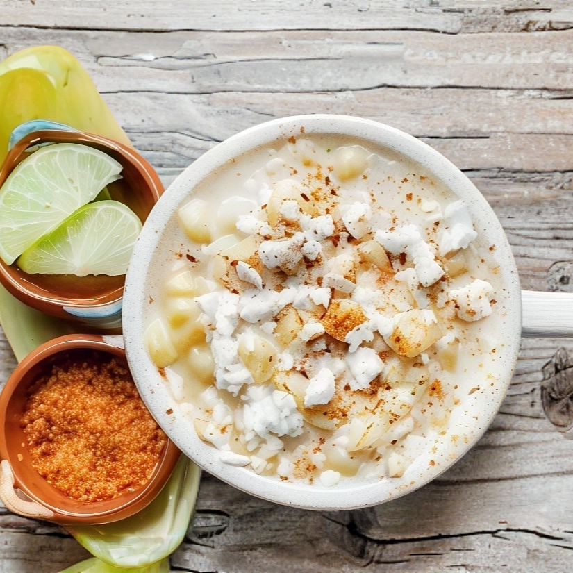 Claro de elote en vaso de 6oz aderezado con mayonesa, mantequilla, limón, queso rayado y chile al gusto(picoso o no picoso)