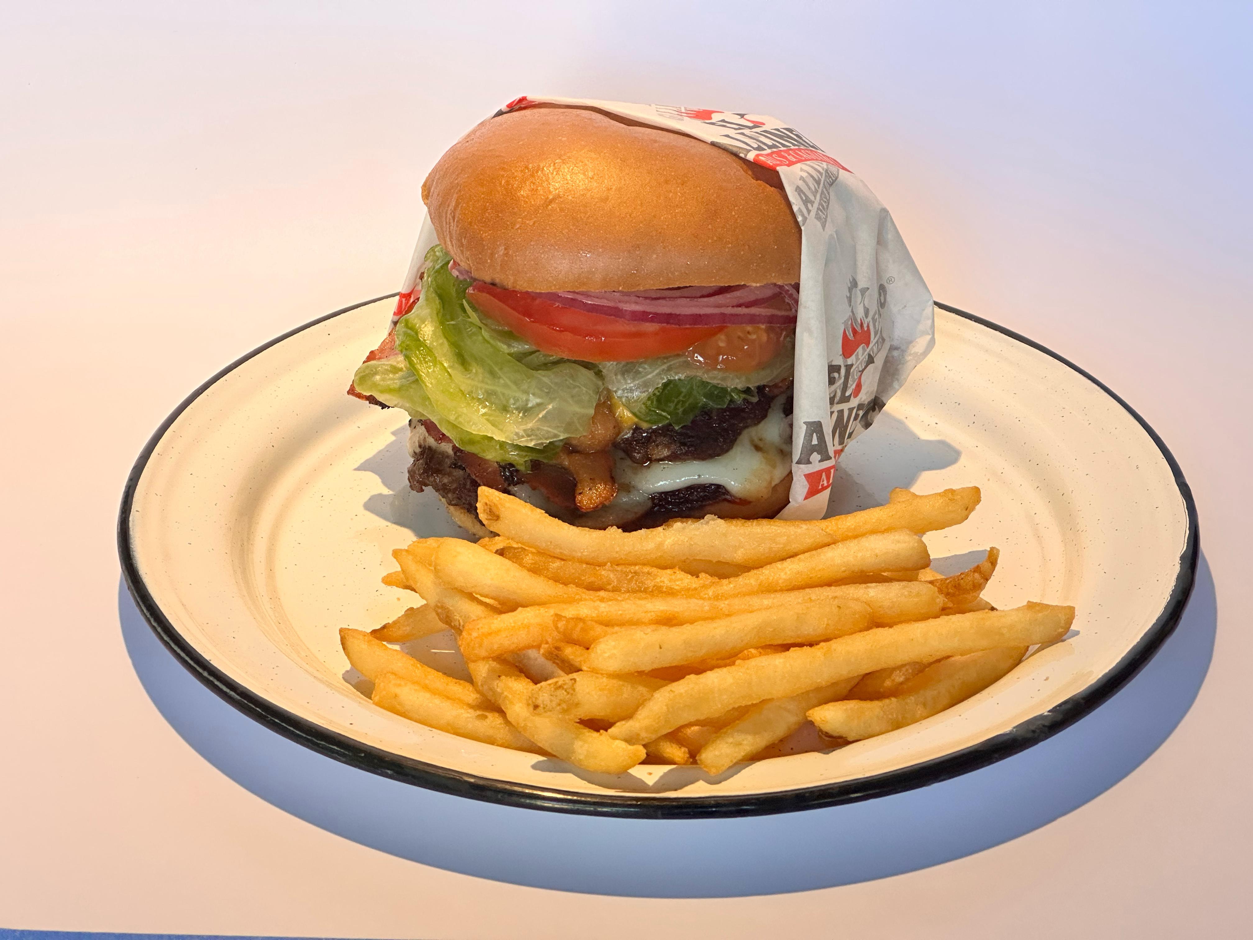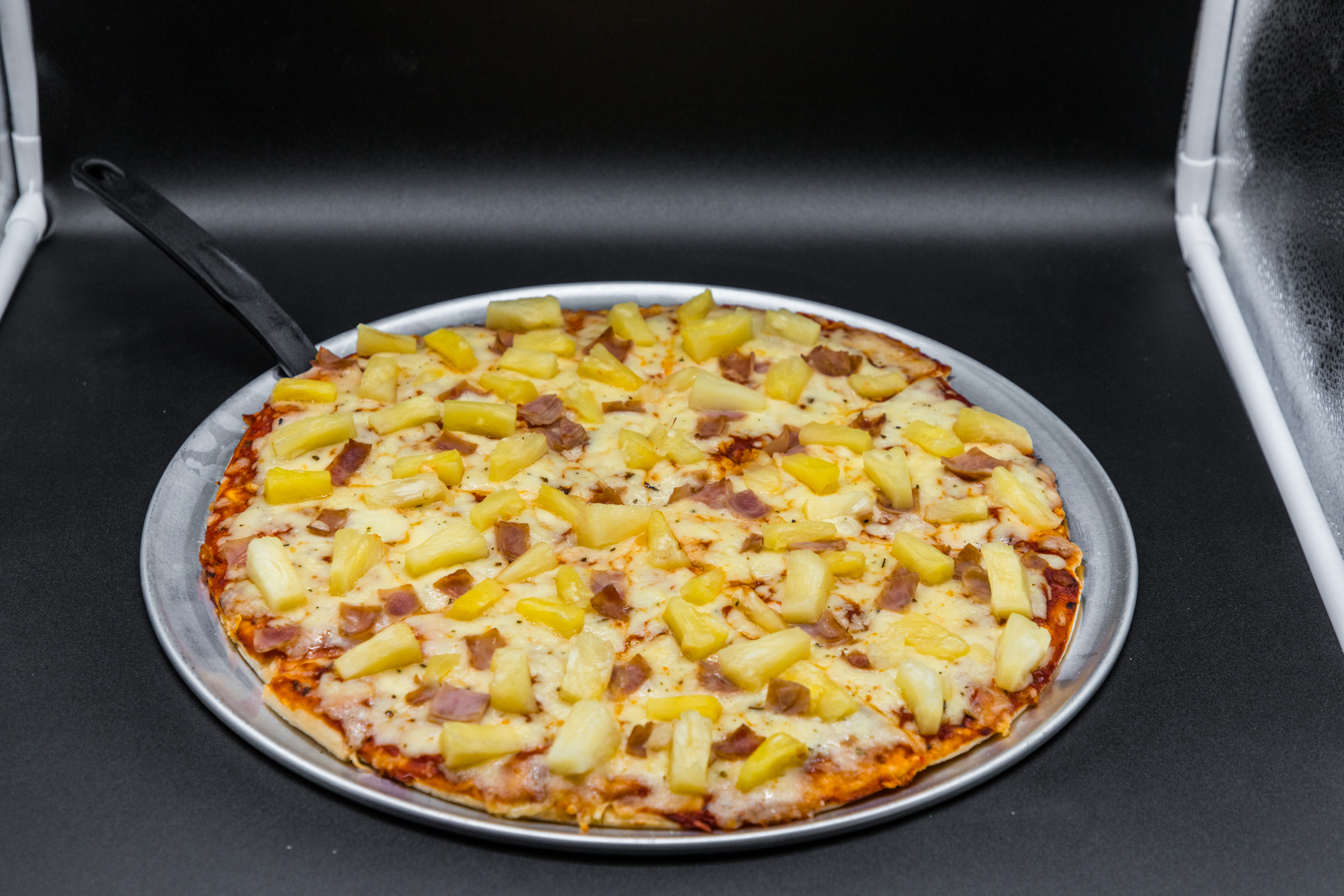 Carne de res, queso americano, queso blanco, piña y tocino.