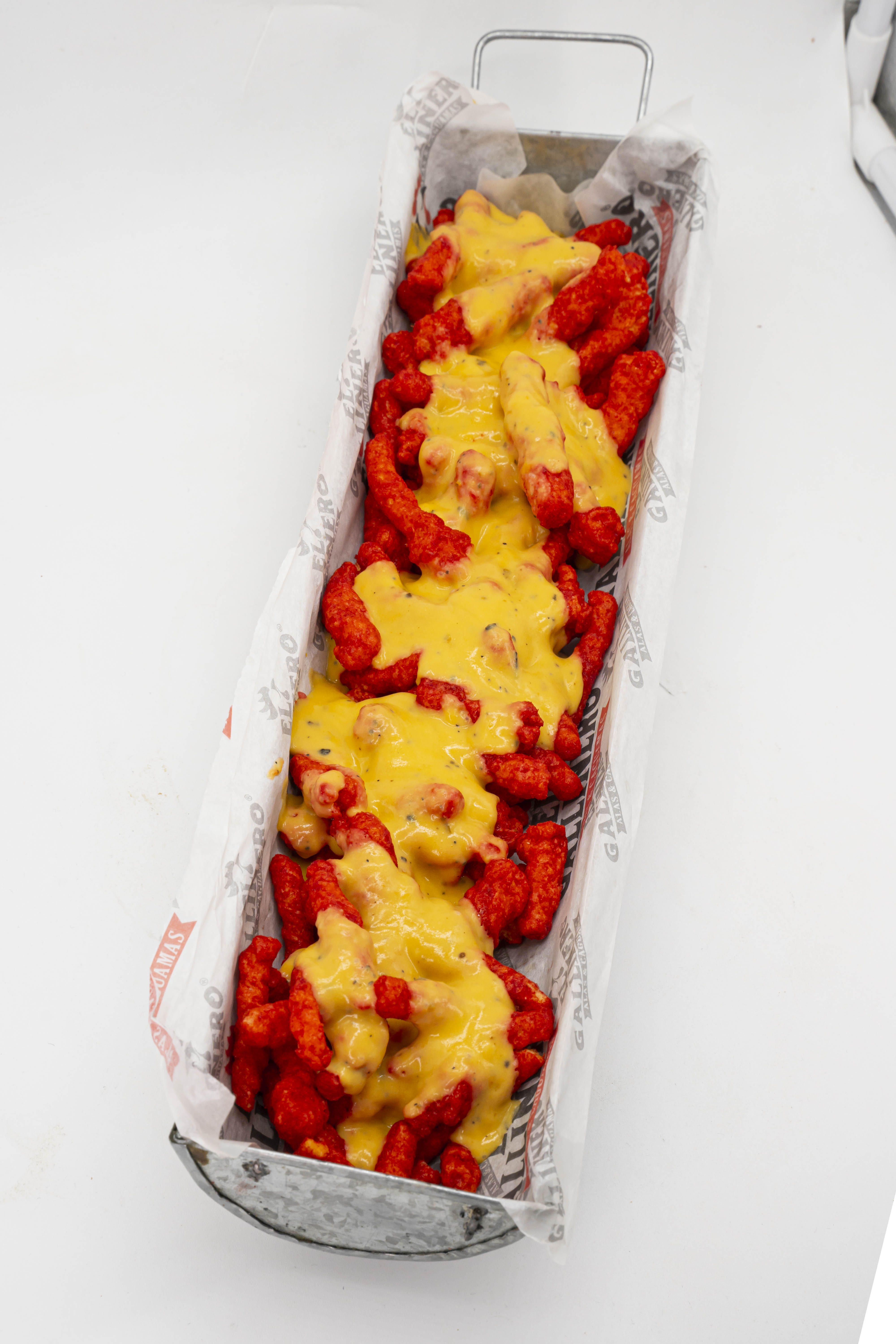 145 g De Cheetos Flaming Hot bañados de salsa de queso.