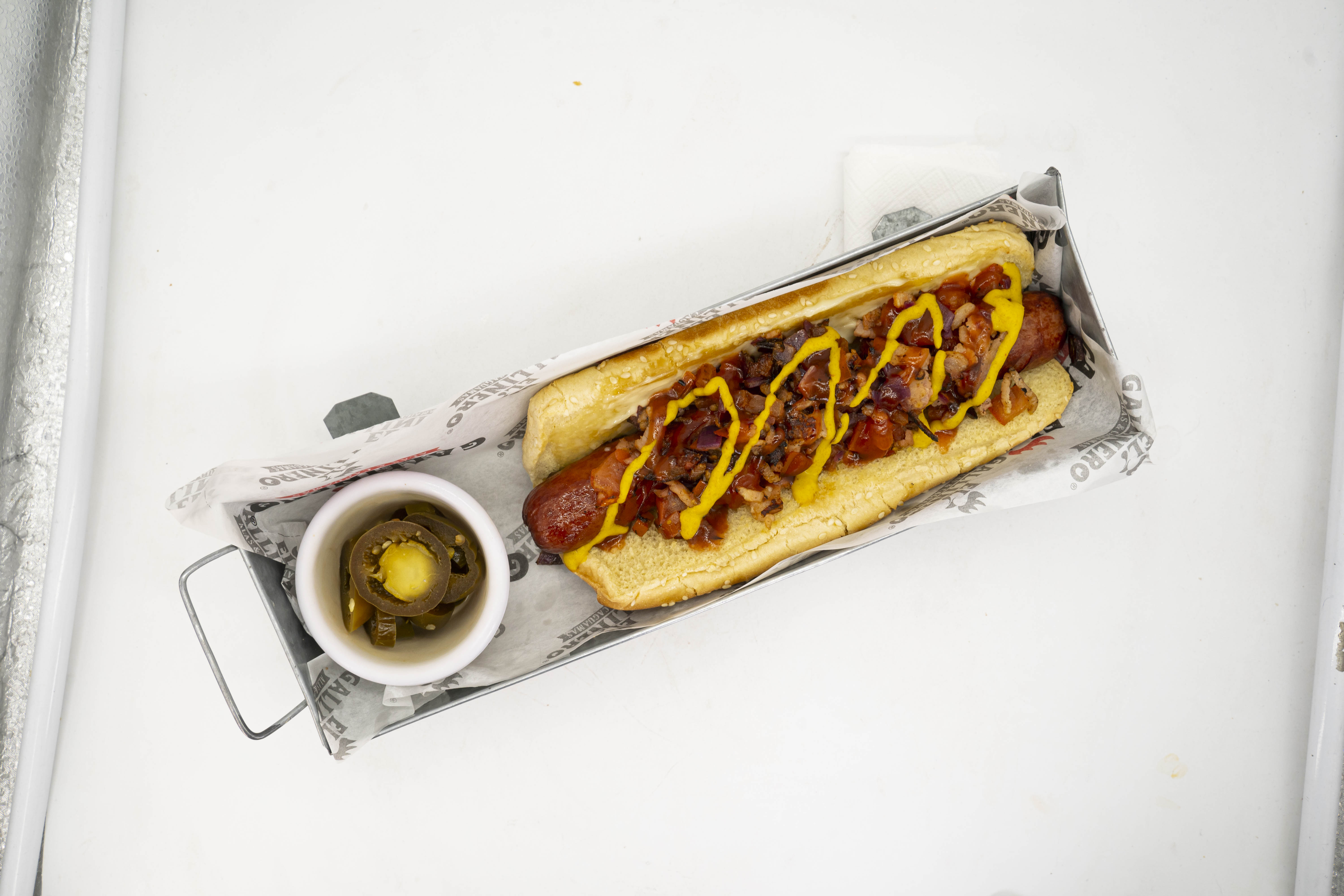 1 Pieza de 20 cm, salchicha de res, tocino, cebolla asada y jitomate.