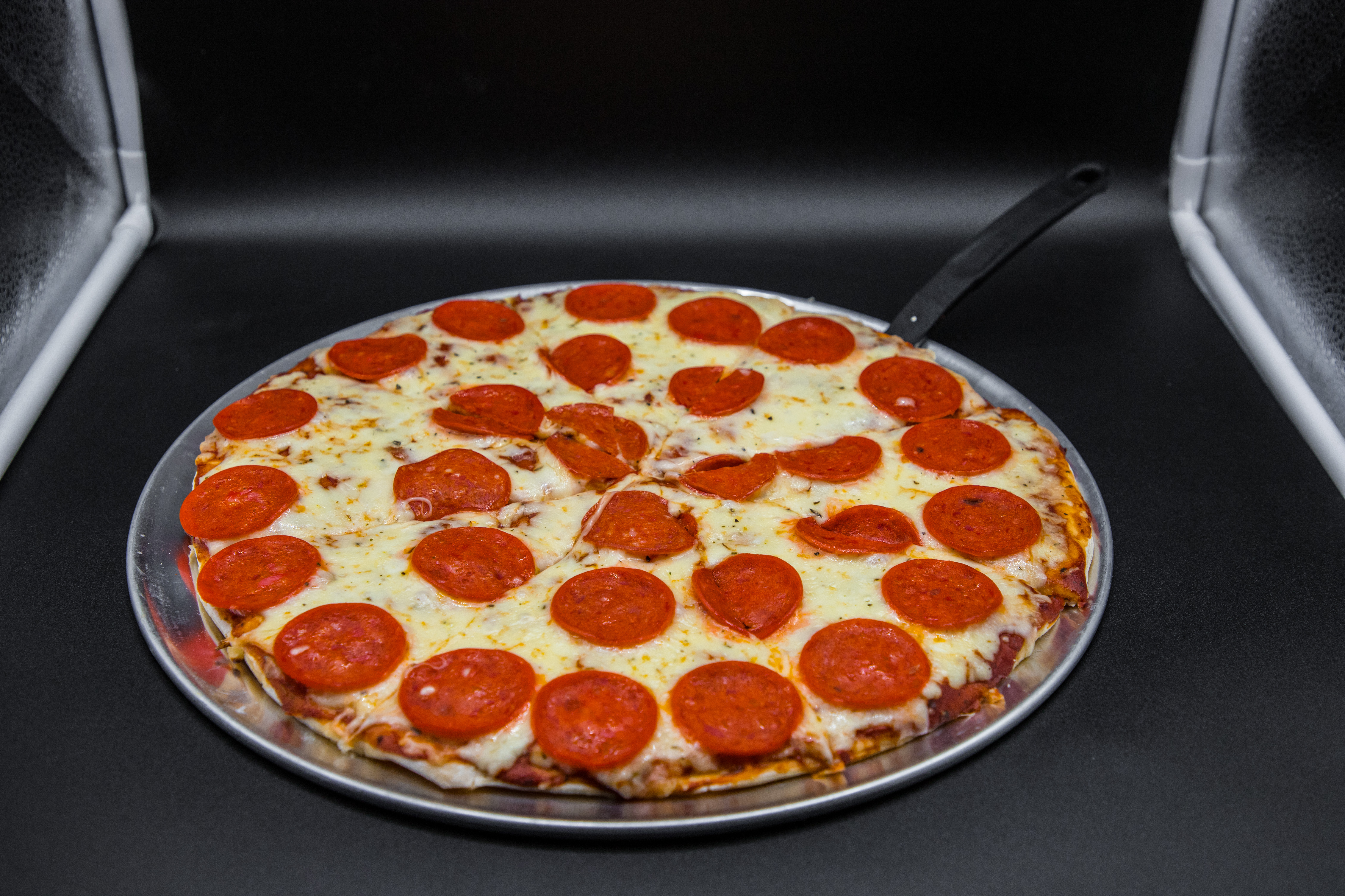 Pizza con queso mozzarella, pepperoni, cebolla, aceitunas negras y jalapeño.