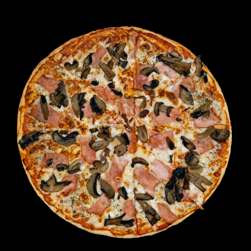 Pizza 37 cm. Queso Mozzarella, salsa de tomate, albahaca, champiñones y jamón de pavo.