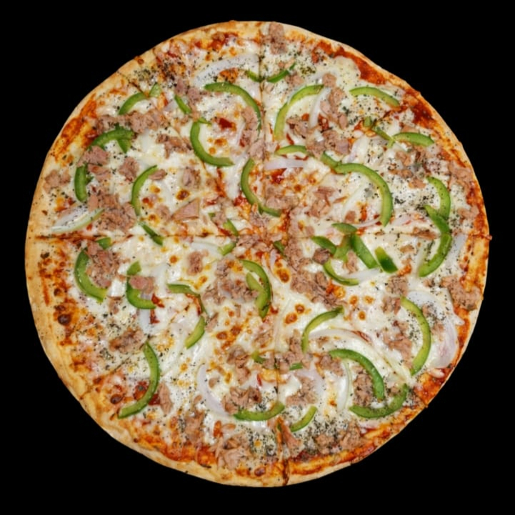 Queso mozzarella, salsa de tomate, atún, pimiento verde y cebolla.