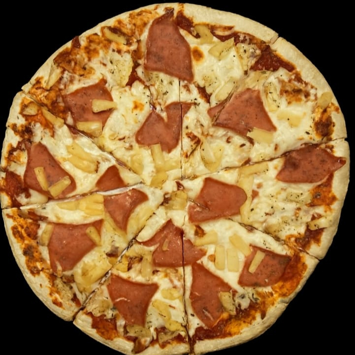 Queso mozzarella, salsa de tomate, piña y jamón de pavo.
