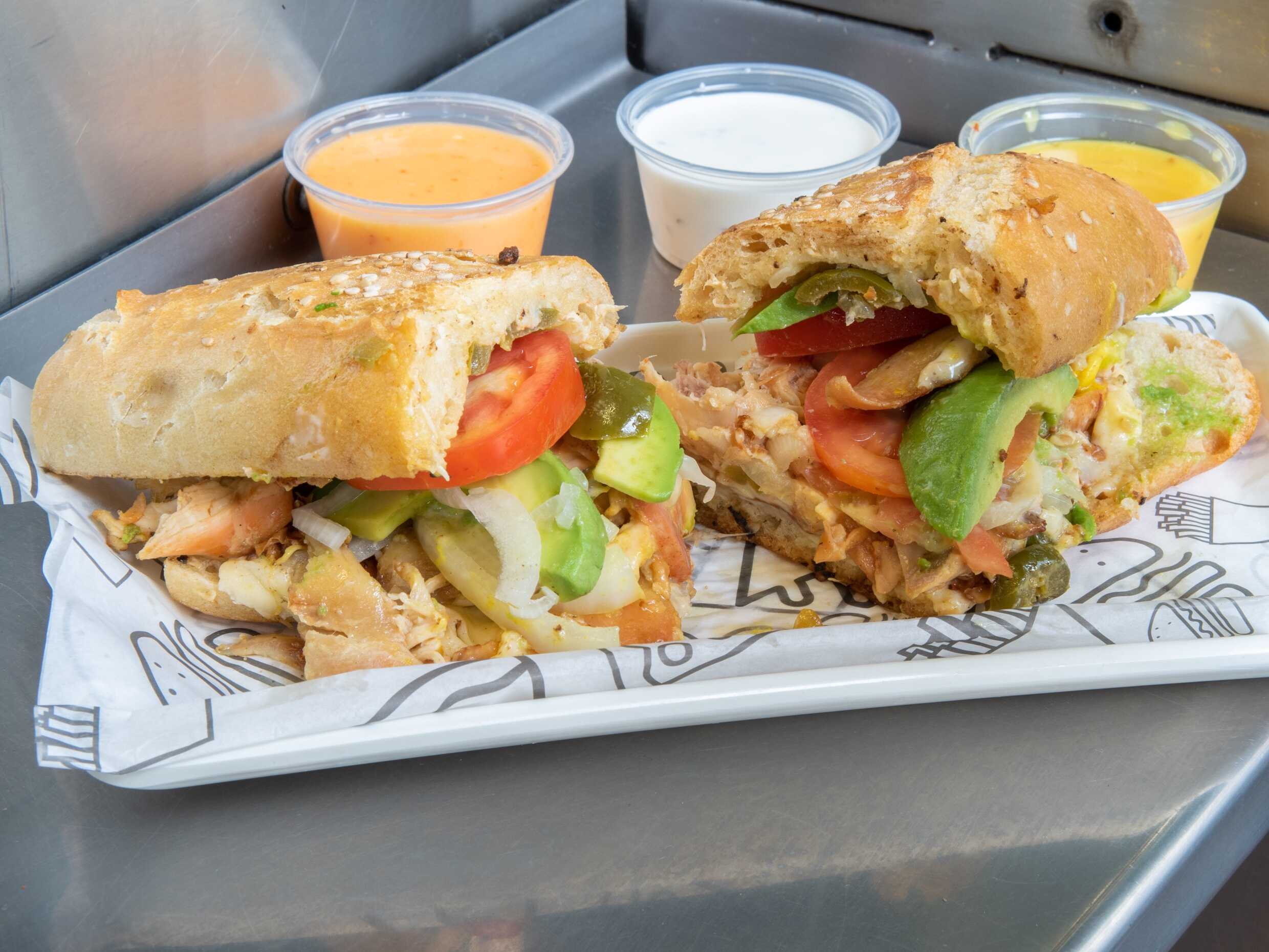 Doble porción de queso oaxaca, aguacate, cebolla, chile, jitomate, mayonesa y mostaza.