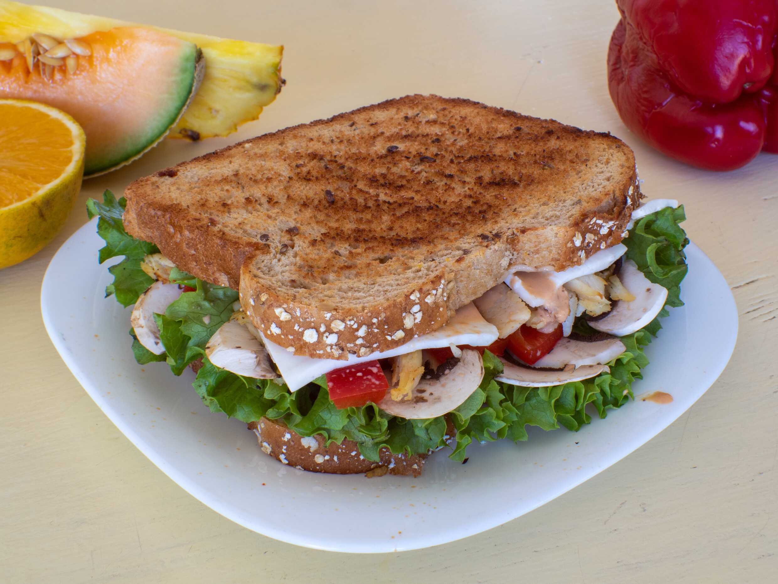 Mayostaza, lechuga, pollo chipotle, queso panela, pimiento morron, champiñones