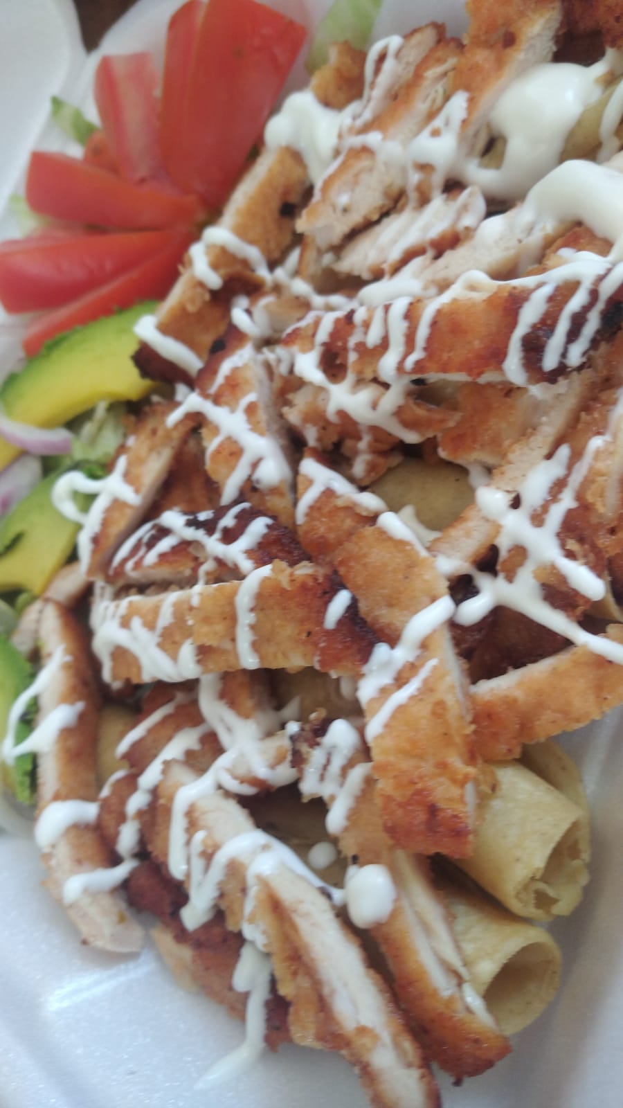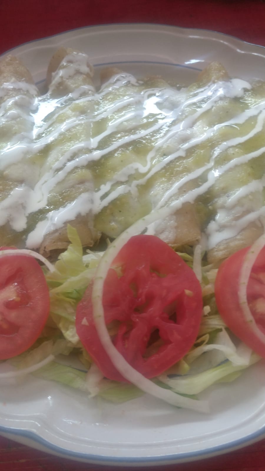 Flautas relleno de frijoles, lechuga jitomate, cebolla, aguacate, crema y salsa.