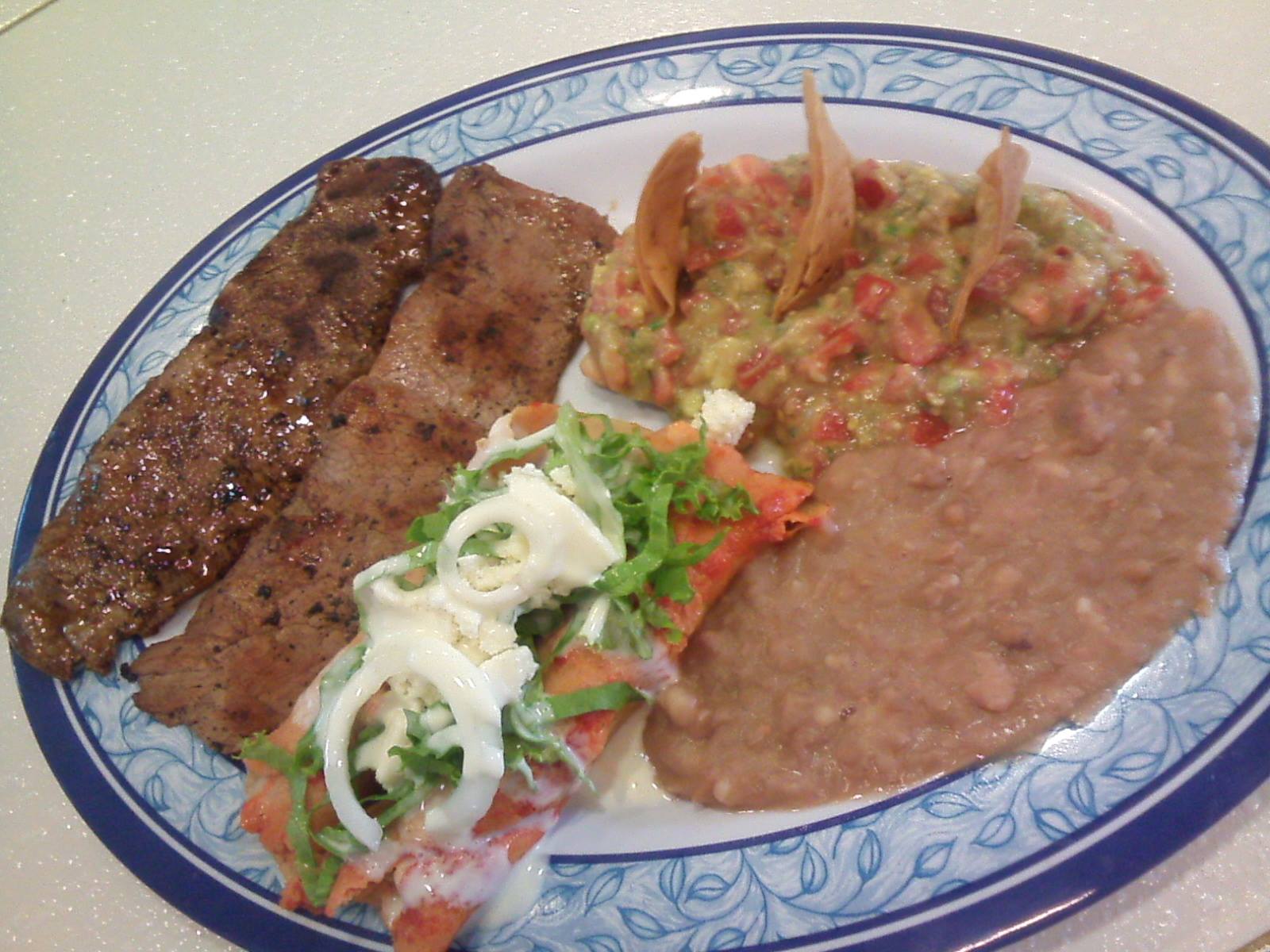150 g de carne asada acompañada de dos enchiladas rojas rellenas de pollo y cubiertas de lechuga, jitomate, queso, crema, guacamole frijoles fritos con sopa de entrada, tortillas, salsa y limones.