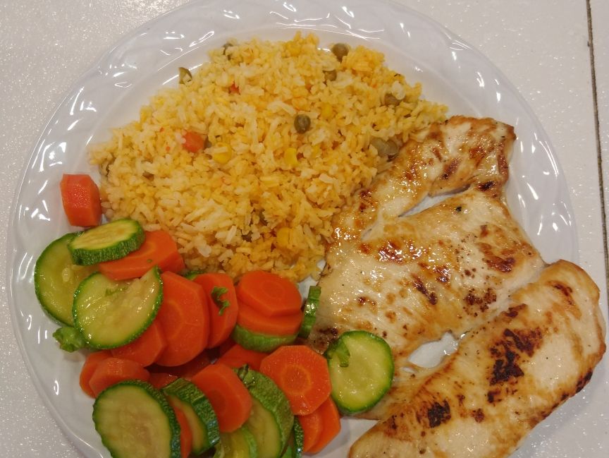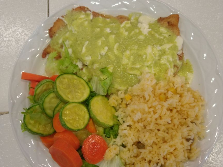 Filete de tilapia, acompañado de arroz guacamole y ensalada. Incluye: Sopa del día, tortillas y salsa.