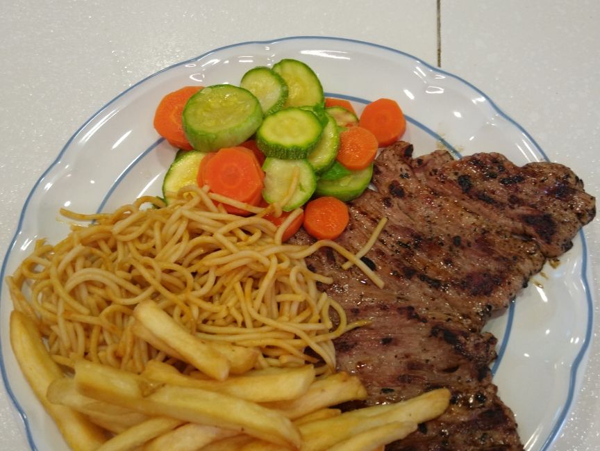 Bisteck de res a la plancha, incluye: Sopa de entrada. ¡Elige tus guarniciones!