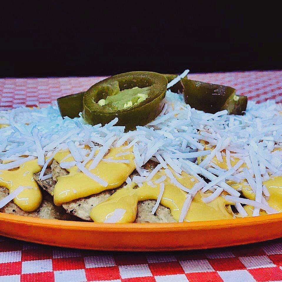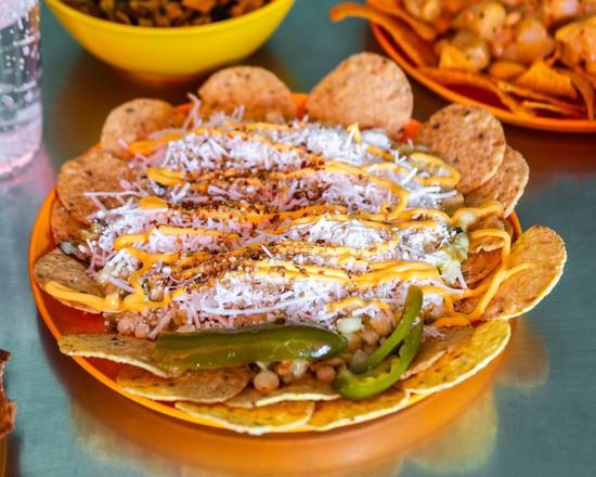 Preparado con Tostitos, queso amarillo caliente, chiles en vinagre y queso blanco opcional.