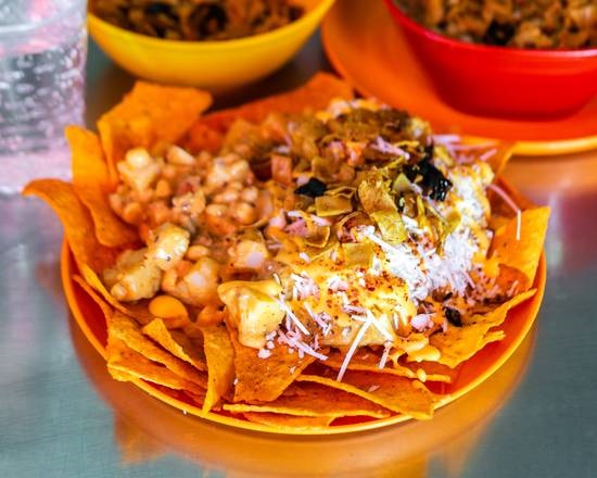 Preparado con Tostitos, queso amarillo caliente, chiles en vinagre y queso blanco opcional.
