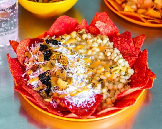 Bolsa de doritos, 185 gr, preparada con elote, 295 gr, mantequilla, mayonesa, queso amarillo, crema, cacahuate, ajonjolí, limón, sal, se sugiere salsa casera a elegir según paladar y queso.
