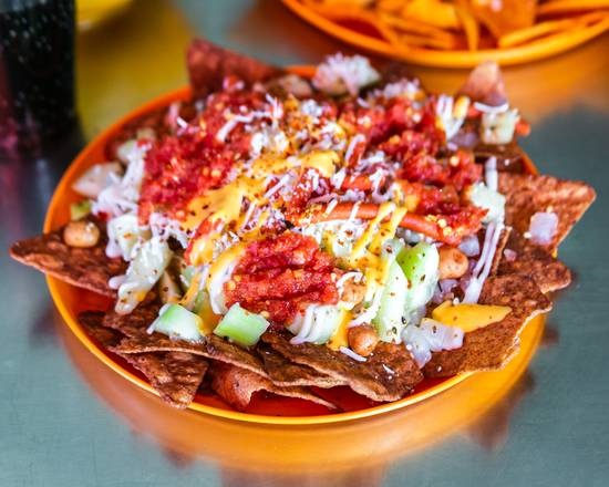 Doritos preparados con cuernitos, pepino, jícama, cacahuate japonés, churros enchilados, salsa de jitomate (no picosa), limón, salsas tradicionales de tu preferencia, queso blanco, crema, y opcional queso amarillo y mayonesa.