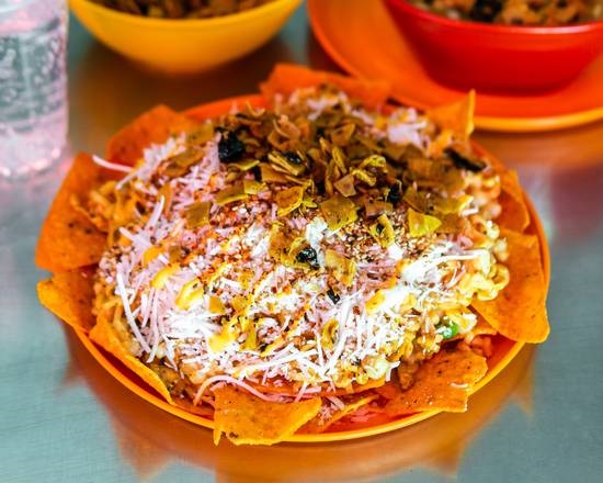 Preparado con elote, Maruchan, Doritos, mantequilla, mayonesa, queso amarillo, crema, cacahuate, ajonjolí, limón, sal, se sugiere salsa casera a elegir según paladar y queso.
