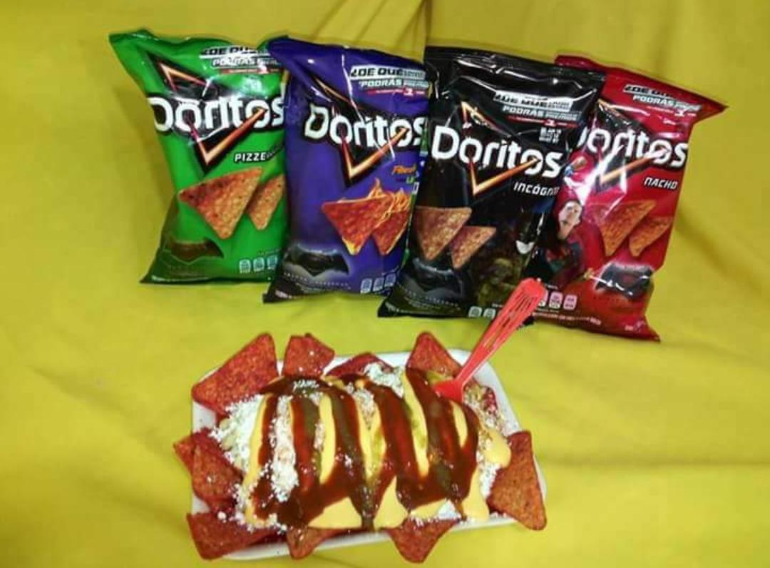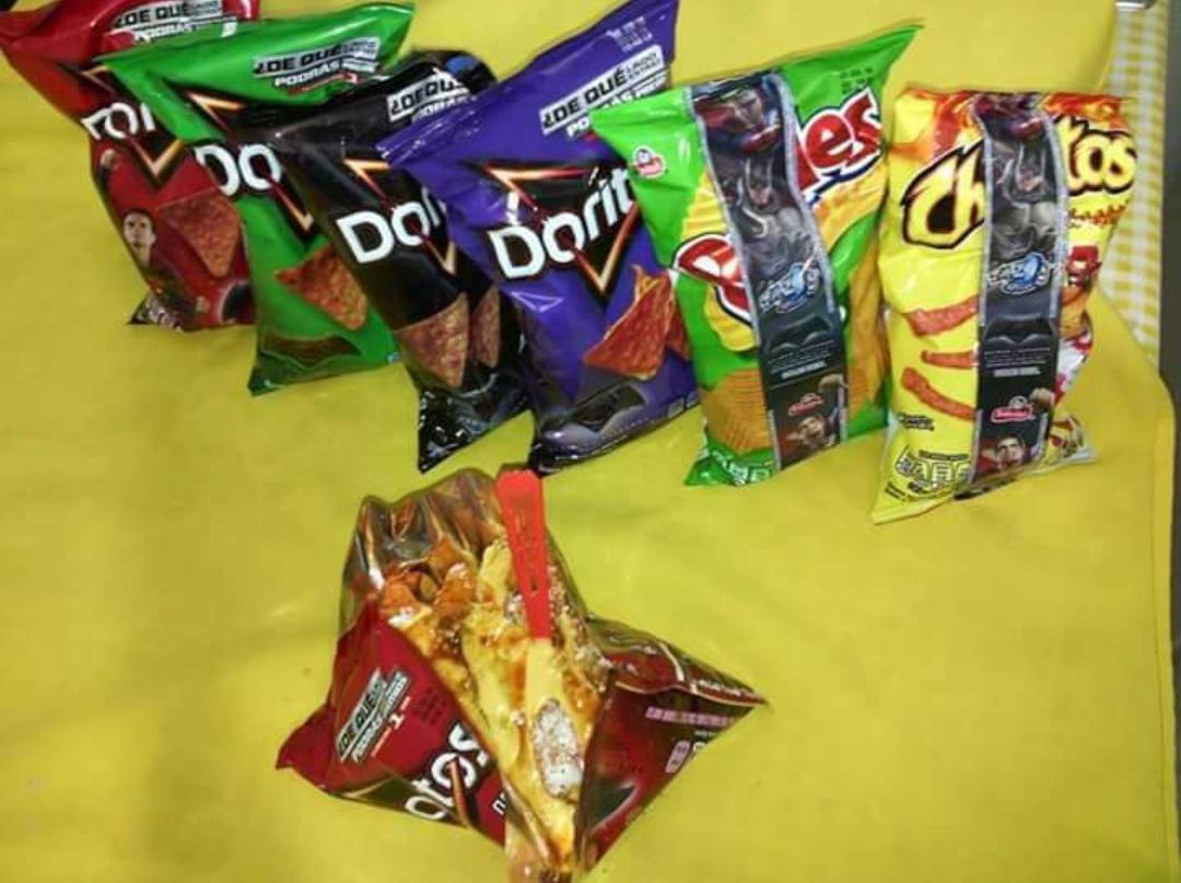 Doritos, elote, queso blanco, chile en polvo no pica, chile en polvo mas o menos, chile en polvo picoso, sal, mayonesa, mantequilla, limón, queso amarillo, chipotle, chile verde