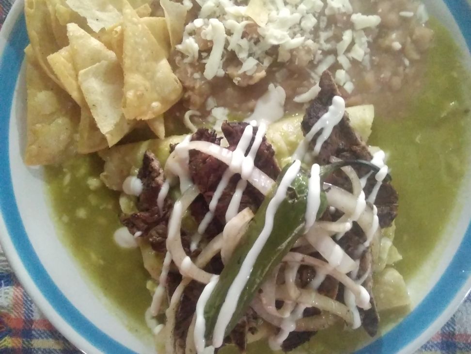 5 piezas rellenas de queso bañadas en Suiza con asada de pollo o res, frijol y totopos