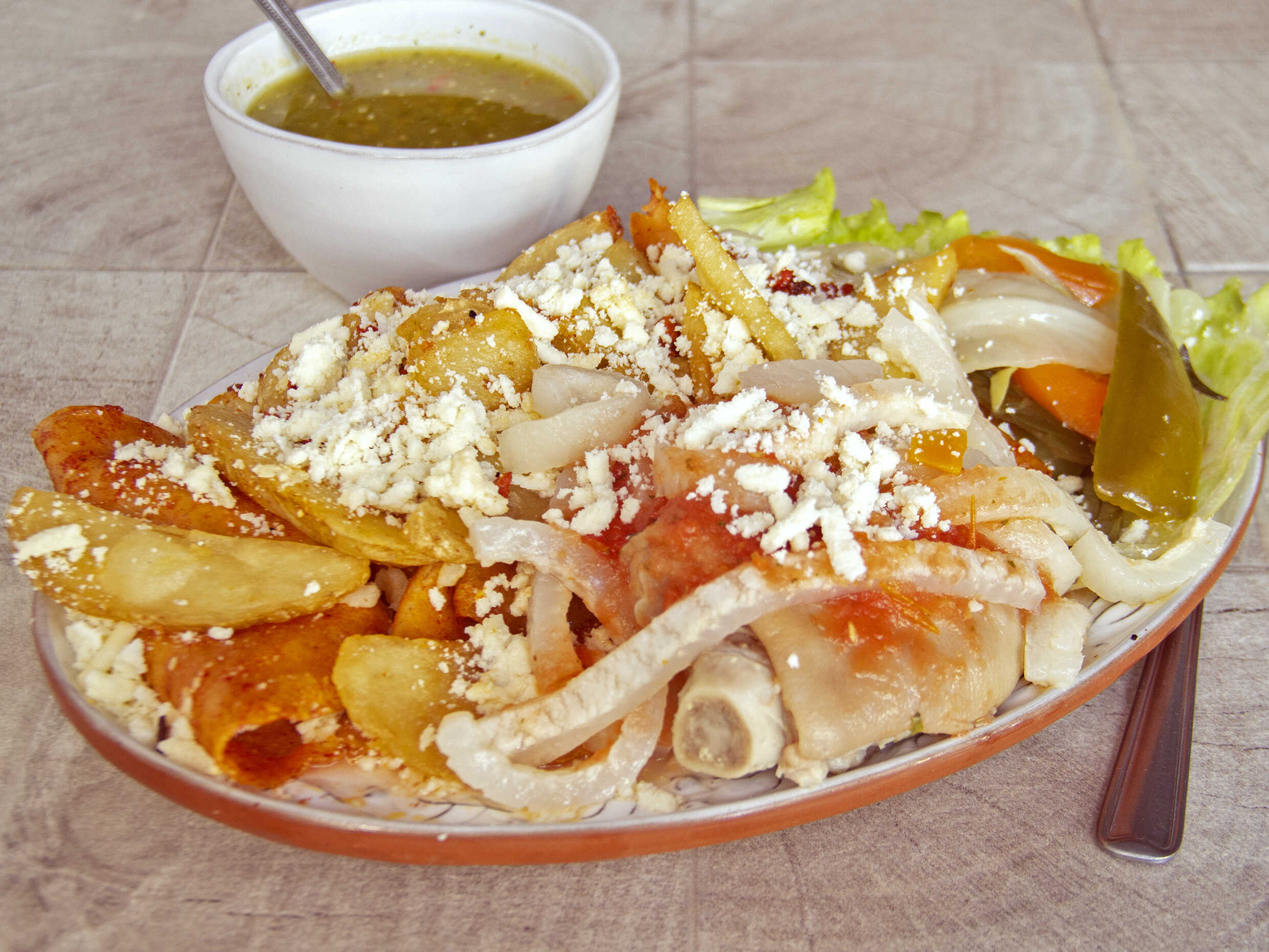 Servidos con lechuga, jitomate, cebolla, crema, queso y salsa verde y de jitomate