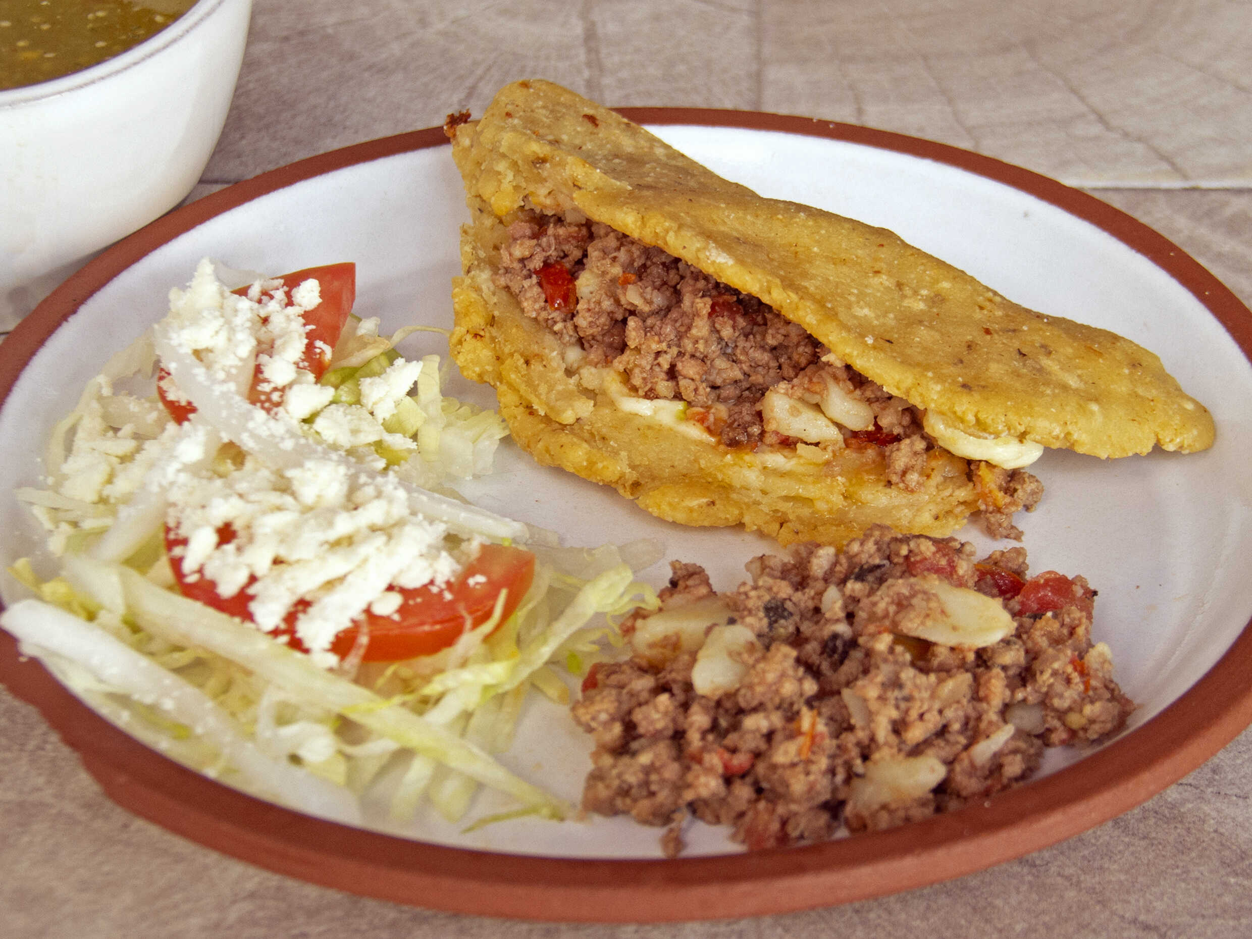 Quesadillas de masa quebrada fritas,servidas con lechuga,jitomate,cebolla,queso,crema y salsa verde