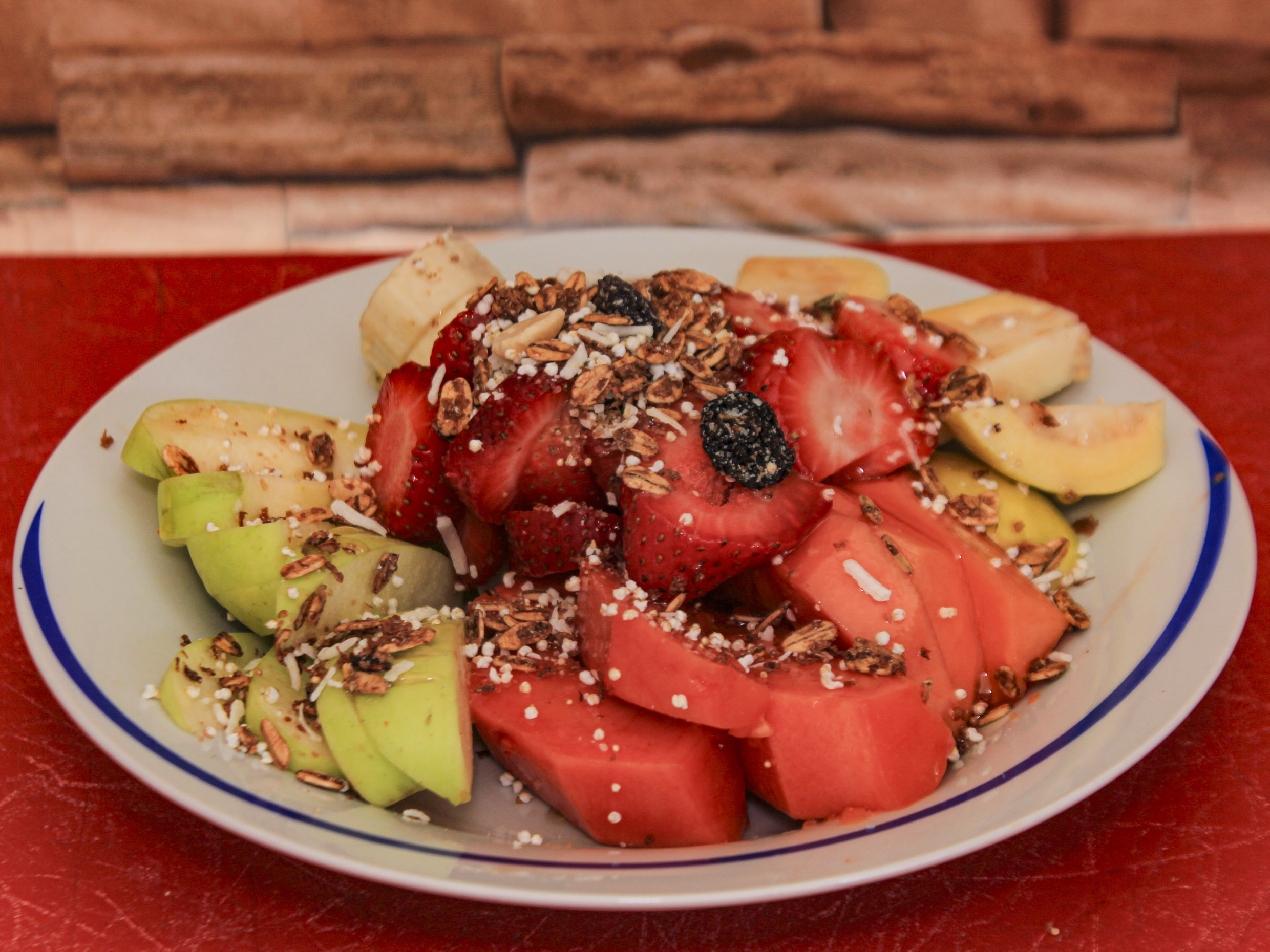 Papaya, manzana, plátano, guayaba,fresa, leche, azúcar, cereal, avena, linaza, granola, amaranto