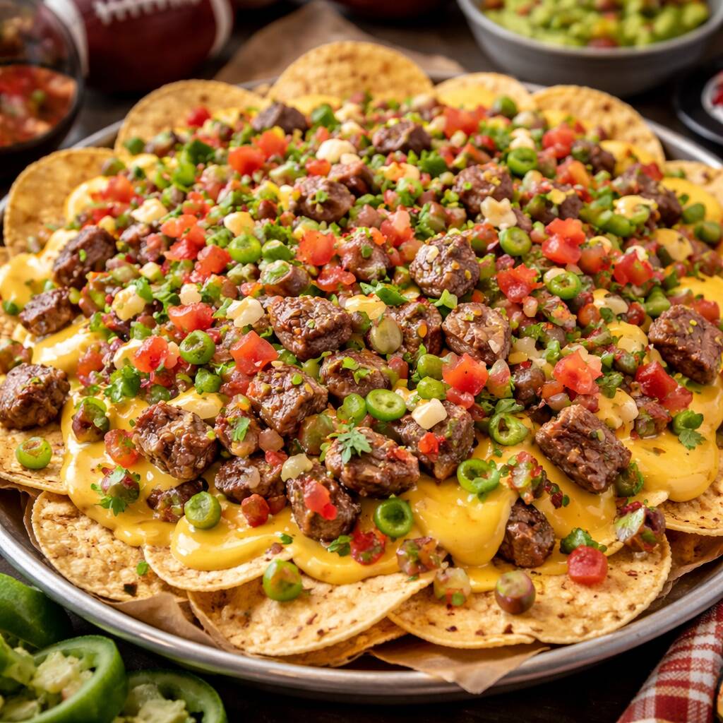 Deliciosos nachos con queso, bistec y exquisito pico de gallo