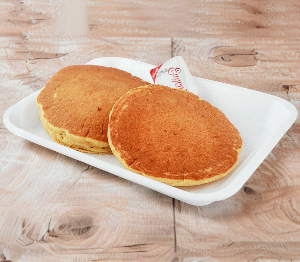 2 Hot Cakes sencillos acompañados de miel maple para un toque dulce irresistible. ¡Perfecto para cualquier momento!
