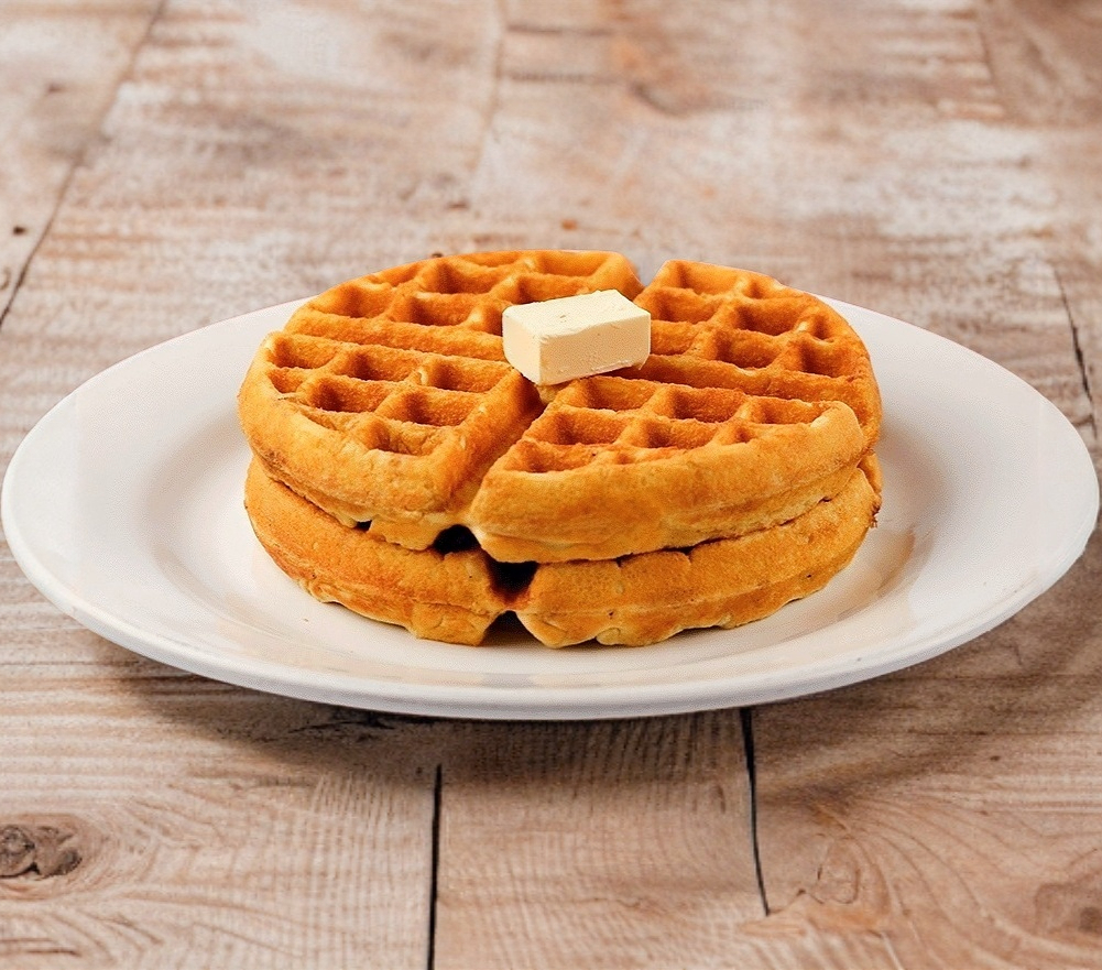 Dos waffles dorados y esponjosos, acompañados de miel de maple para un toque dulce y perfecto. ¡Ideal para consentirte!