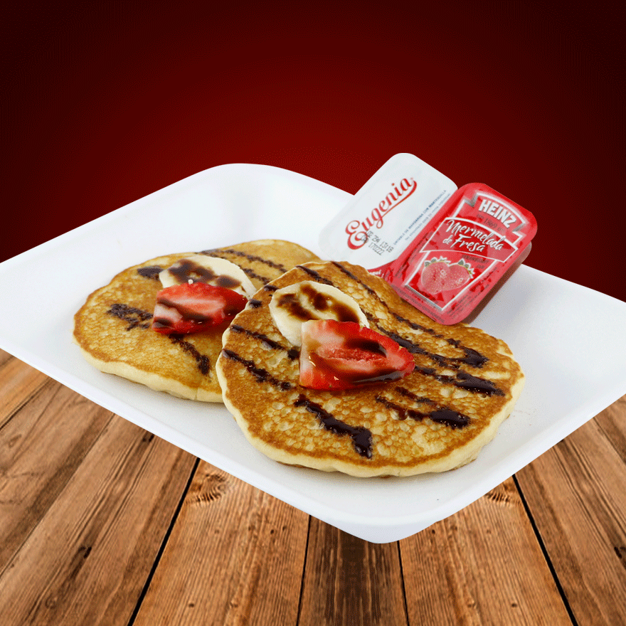 hot cakes esponjosos preparados con nuestra deliciosa pasta de la casa, acom- pañado con plátano y fresa bañados en chocolate.