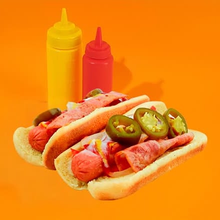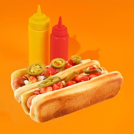 2 pz de hot dogs, preparados con salchicha doradita, jitomate, cebolla.