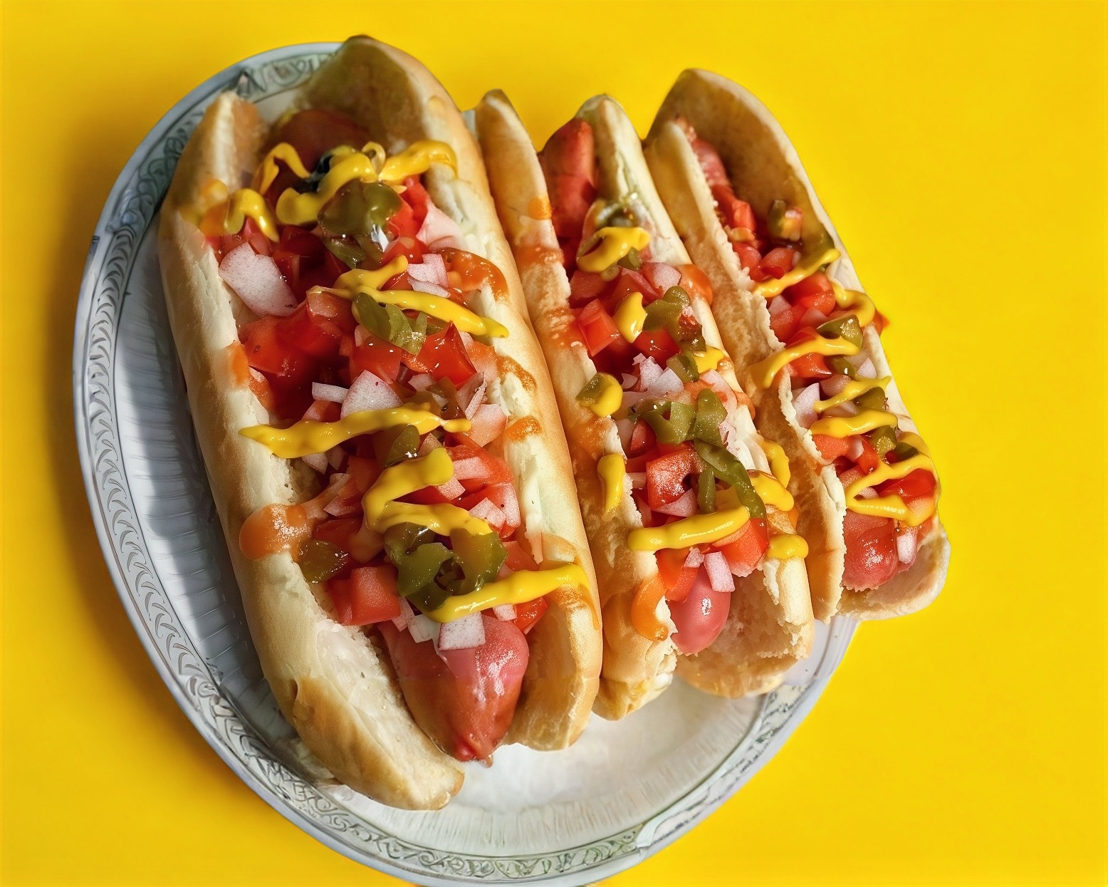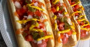 Salchicha dorada, Pan Hot-Dog, cebolla, jitomate, mayonesa, catsup, mostaza