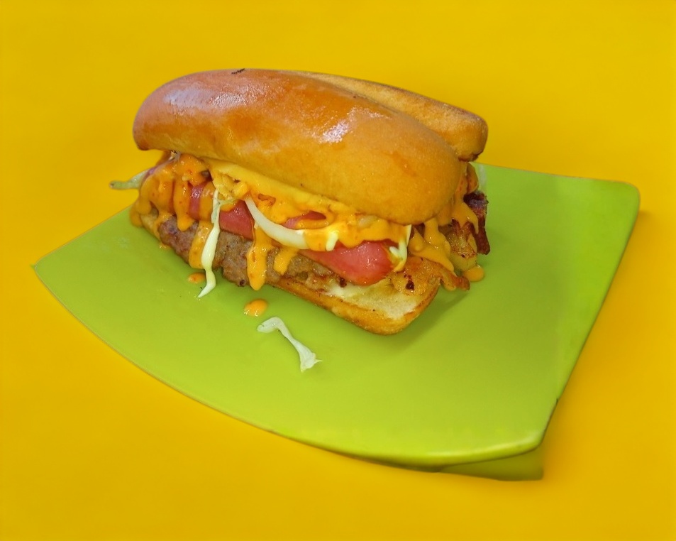 Salchicha dorada, queso asadero, Pan Hot-Dog, cebolla, jitomate, mayonesa, catsup, mostaza