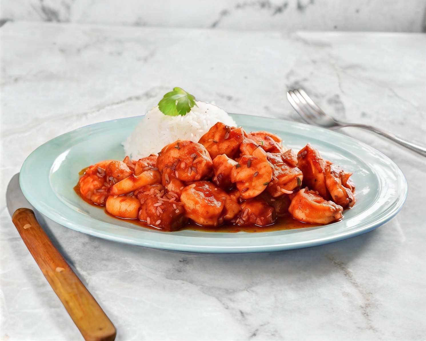 Arrachera y Camaron (250 gr entre arrachera y Camarones) sofrito a la plancha acompañado de pimientos y cebolla con queso gratinado. Acompañado de tortillas