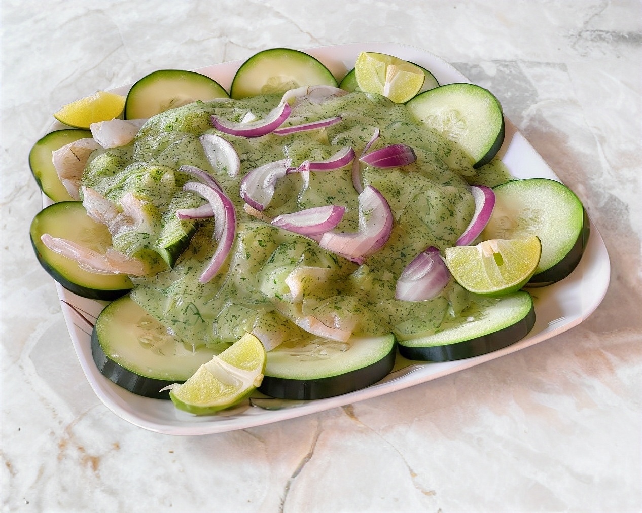 Camarones marinados en jugo de limon ,sal y chiles serranos , acompañados de pepino y cebolla morada.