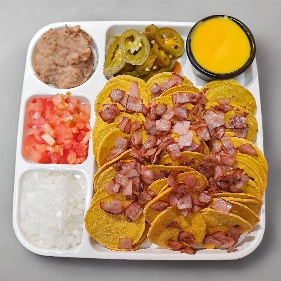 Totopos de maiz, Queso cheddar, tocino, jalapeño, cebolla, jitomate y frijoles refritos.