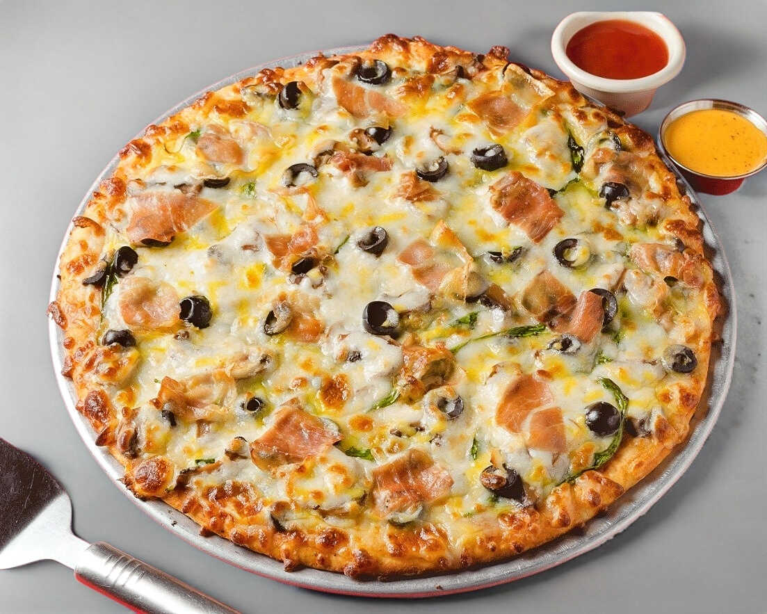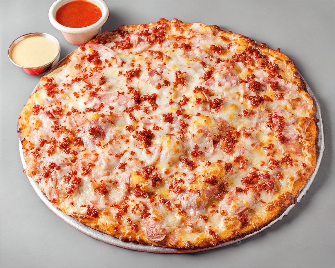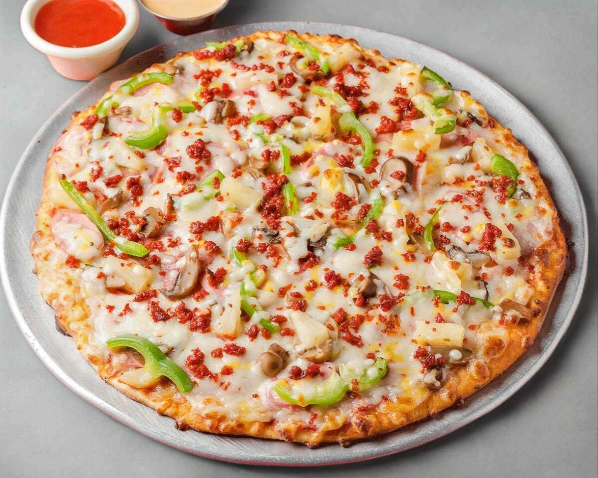 Chica, jamón, champiñones, piña, jalapeño, tocino y granos de elote.