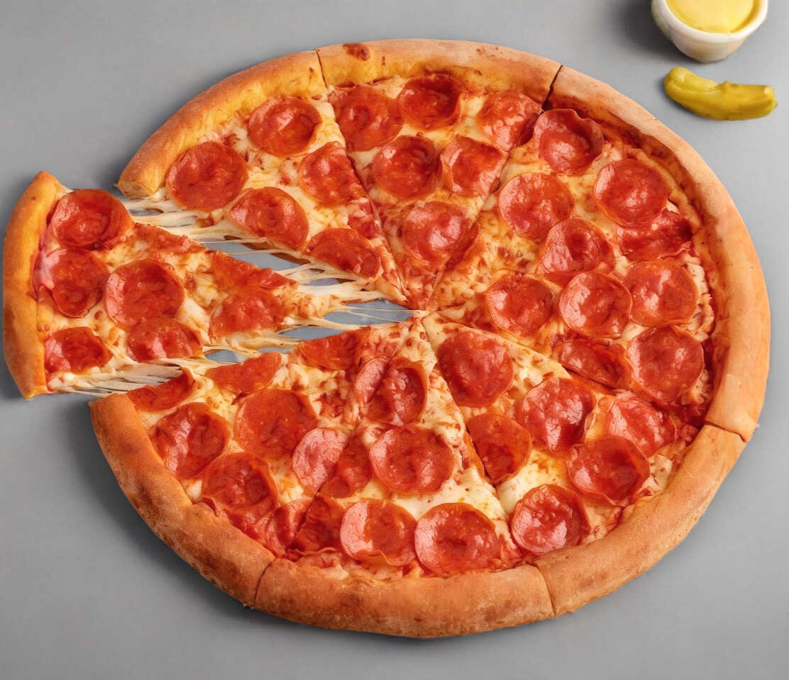 Pizza con 8 rebanadas, para 2 o 3 personas. Jamón, pepperoni o queso
