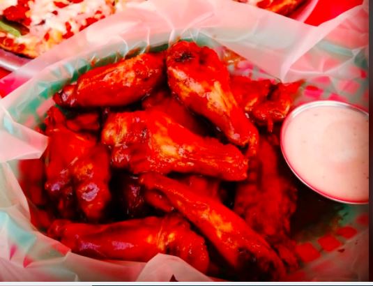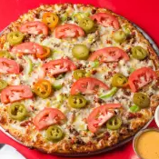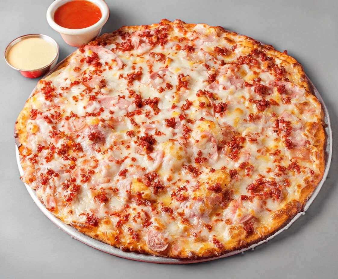 Corona de pizza, rellena de queso y envuelta de tocino, 1 a 4 ingredientes,papas a la francesa chicas y 9 alitas de pollo