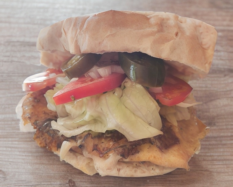Pechuga de pollo, bollo, crema y mayonesa, jitomate, cebolla, lechuga, jalapeño, chimichurri y cátsup.
