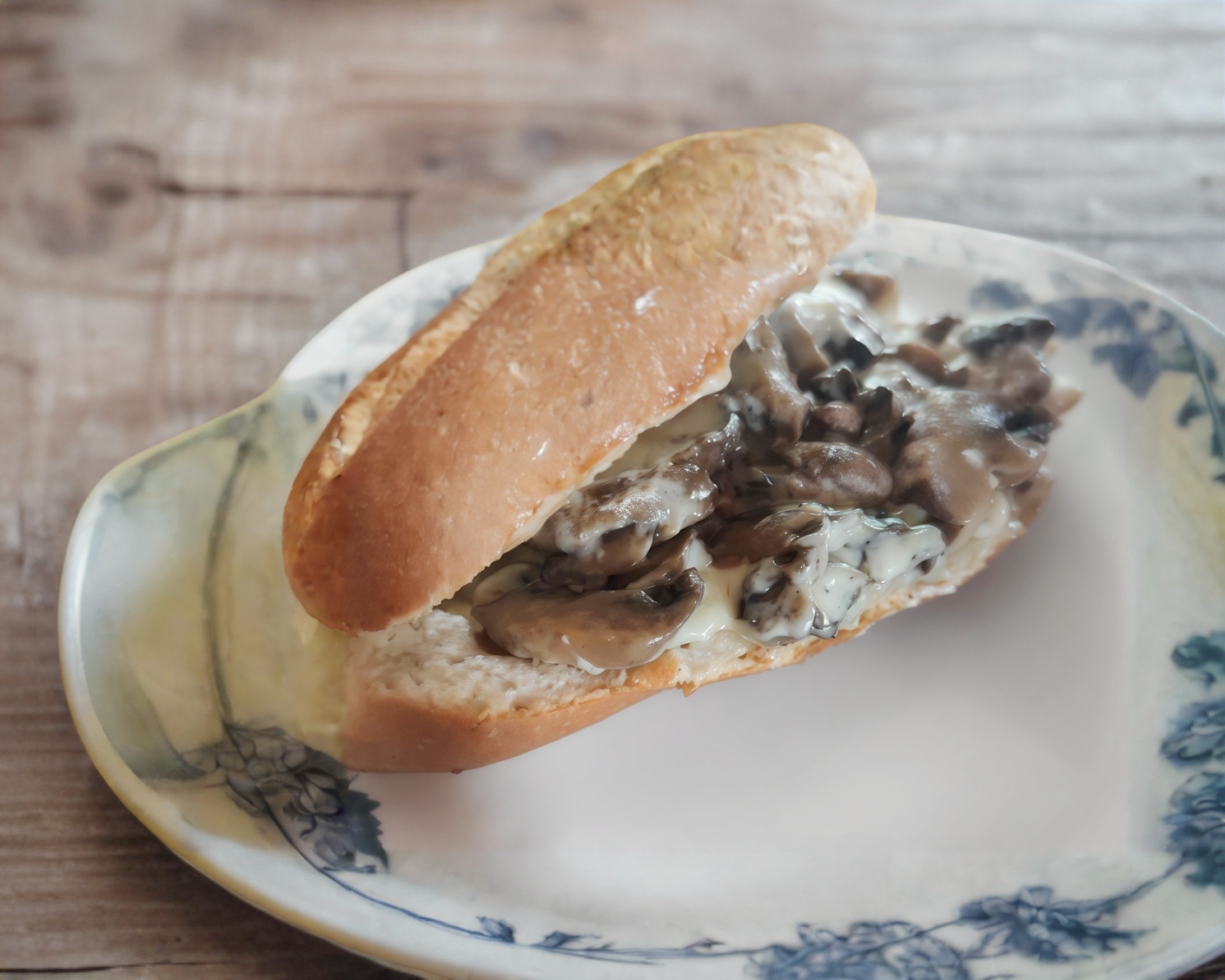 bolillo tamaño estándar con crema y mayonesa, champiñones con queso asadero, jitomate cebolla jalapeño lechuga, chimichurri