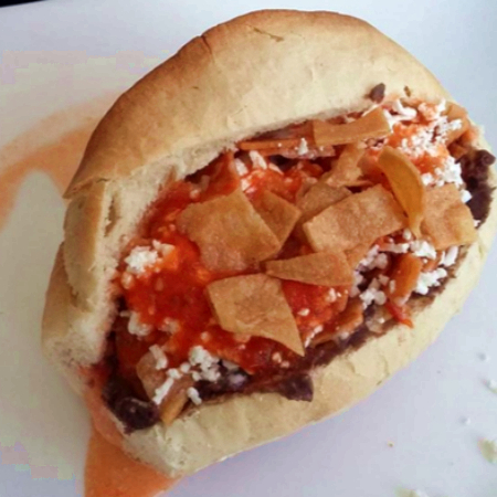 Pan blanco, chorizo de puerco, crema y mayonesa, jitomate, cebolla, jalapeño y salsa roja casera.