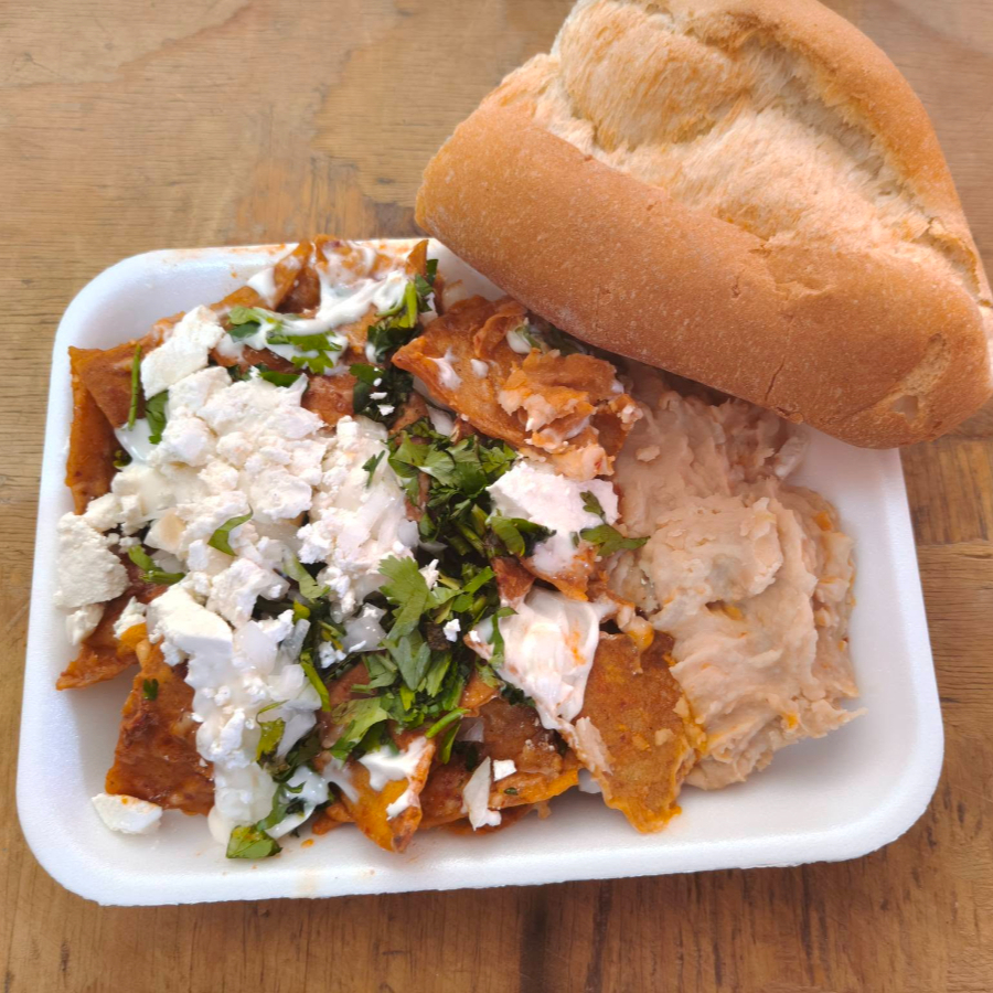 chilaquiles rojos, SALSA ROJA, PICANTE MEDIO acompañado con frijoles, queso de fundir, queso fresco desmoronado, cilantro, cebolla y crema. acompañado con un bolillo