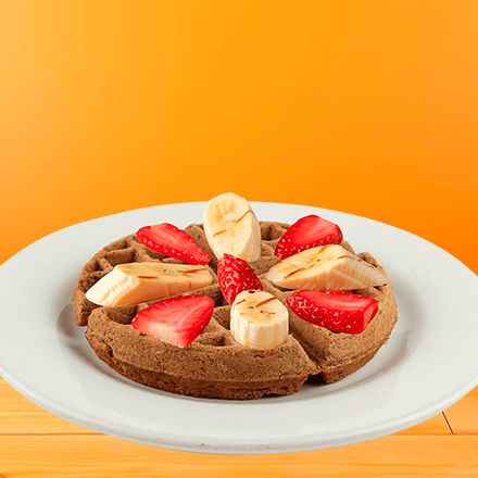 Un waffle preparado con nuestra deliciosa receta de chocolate abuelita, acompañado con plátano y fresa bañado con chocolate o mermelada, o miel maple.