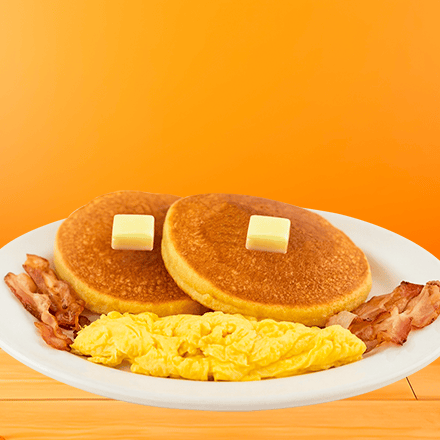 Dos hot cakes recién hechos, acompañados con dos huevos revueltos y tocino en tiras, mantequilla y miel maple.