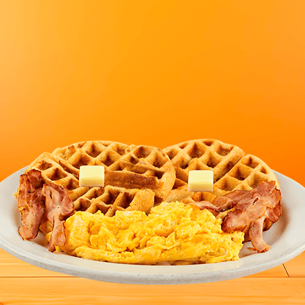 Dos waffles recién hecho,acompañado con dos huevos revueltos y tocino en tiras, mantequilla y miel maple