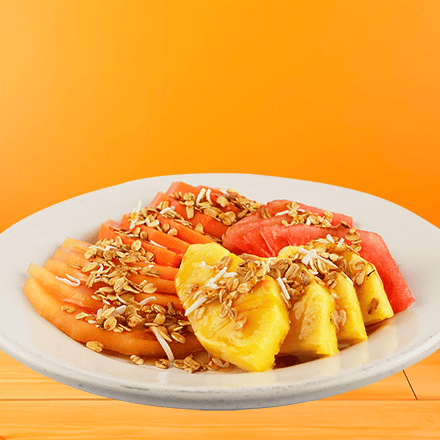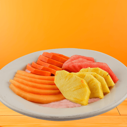(4 frutos a escoger). Papaya, sandia, melón, plátano, piña, fresa, kiwi y manzana. Acompañado con granola y yogur natural o fresa.