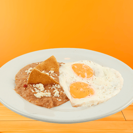Dos huevos estrellados sobre tortilla frita bañados con deliciosa salsa ranchera, acompañados con frijoles refritos. Con tres tortillas de comal hechas a mano.