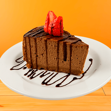 Rebanada de Cheesecake de chocolate cremoso con intenso sabor a cacao y base de galleta.