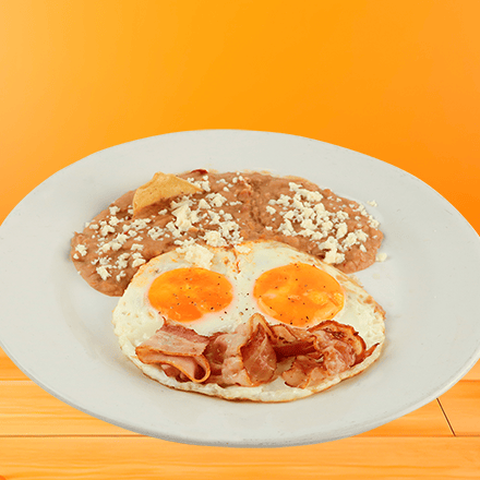 Dos huevos estrellados con tocino en tiras, acompañado de frijoles refritos. Con tortillas de comal hechas a mano.