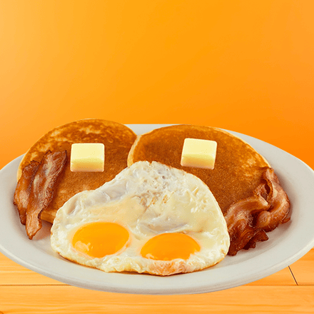 Dos hot cakes recién hechos, acompañados con dos huevos estrellados y tocino en tiras, mantequilla y miel maple.